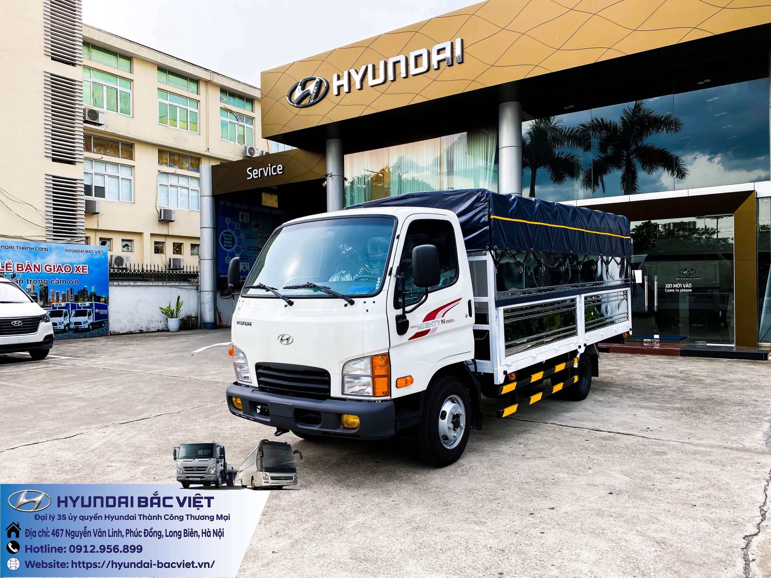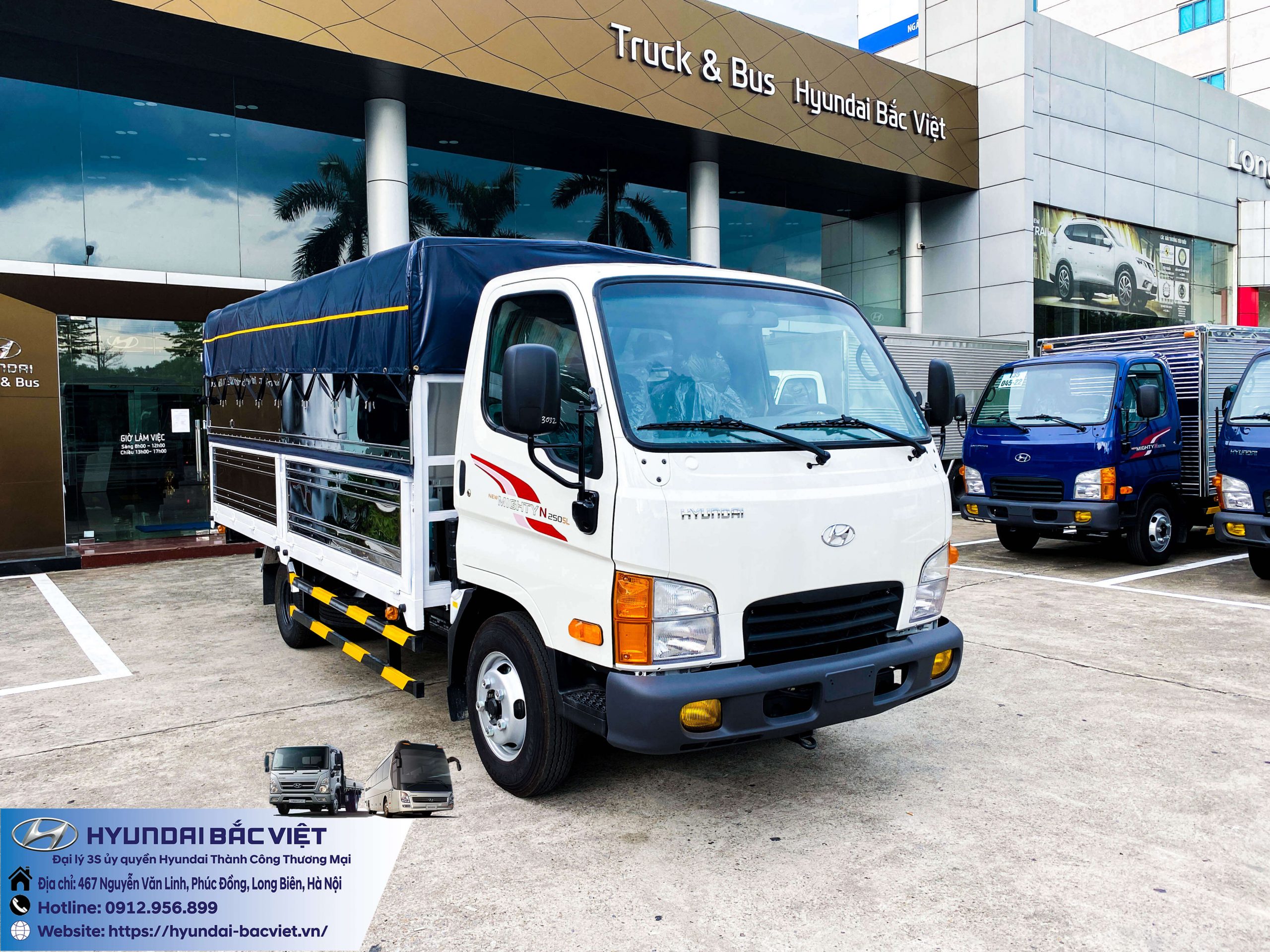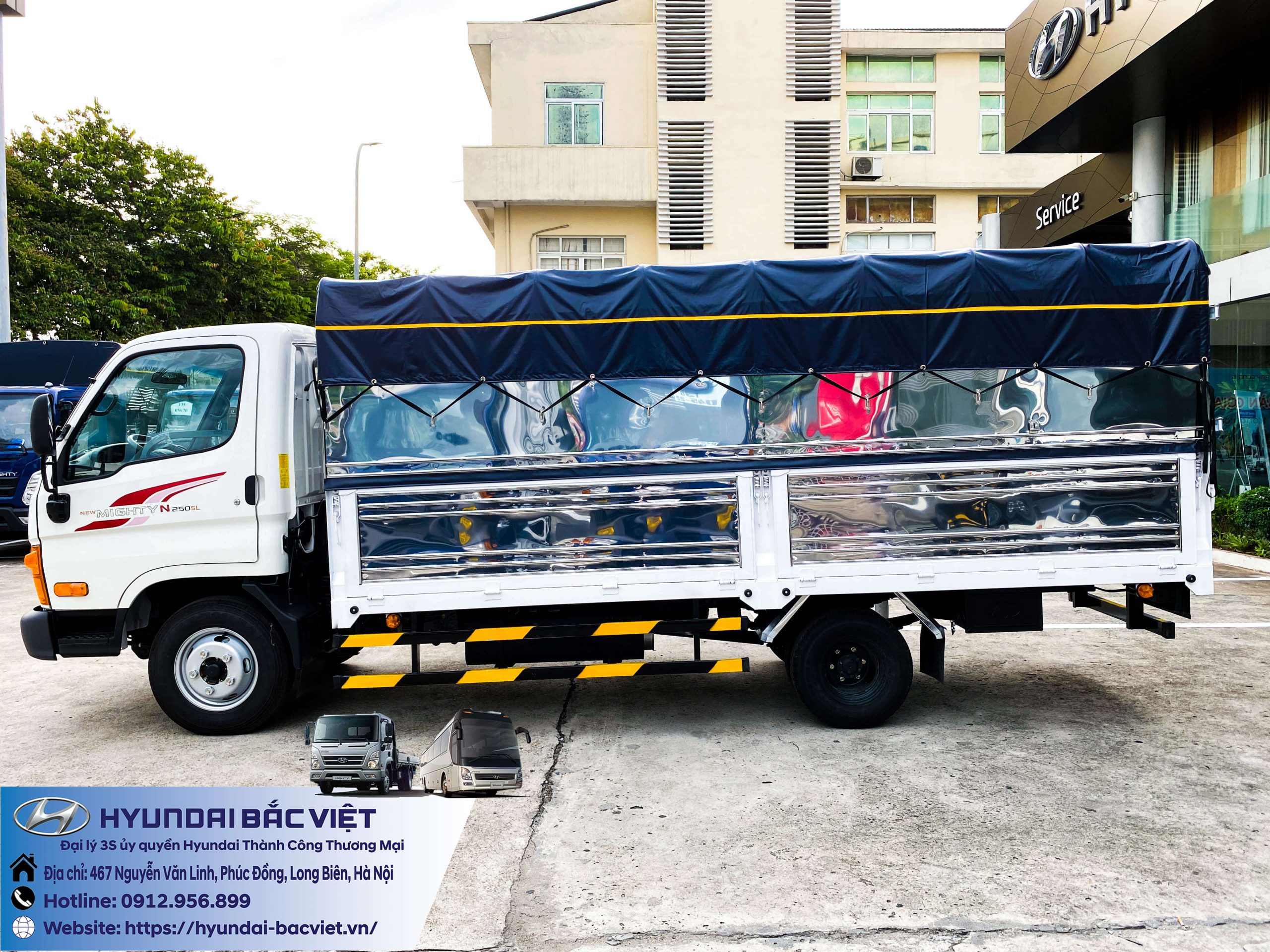 Xe tải Hyundai New Mighty N250SL thùng mui bạt đang được bán tại Hyundai Bắc Việt. Đặc điểm của thùng mui bạt phù hợp với rất nhiều nhu cầu của khách hàng như: Chở cám, lương thực thực phẩm…, những sản phẩm có đặc tính cần độ thoáng cao. Tải trọng của xe lên đến 2 tấn 4. Thùng xe dài hơn 4 mét, rộng gần 2 mét và cao 1.7 mét.